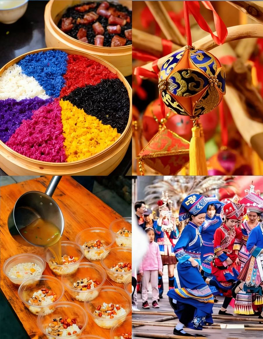 Oprócz śpiewu ludzie świętują, przygotowując pięciokolorowy kleisty ryż barwiony sokami roślinnymi, rzucając haftowanymi kulkami, tańcząc taniec na bambusowych rurach i grając na bębnach z brązu.